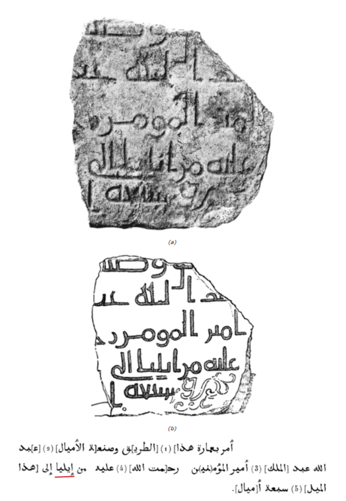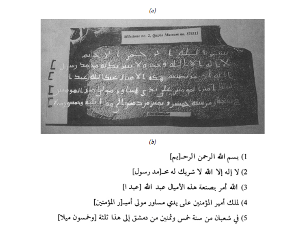 Suriye bölgesi iman beyanı için ikinci bir kaynak da;ʿKudüs ü başkent Şam a bağlayan ve Filistin kıyısından Kudüs e uzanan yol güzergahı üzerinde bulunan mil taşlarıdır. Yol tabelaları olarak kabul edebileceğimiz bazalt taşından yapılmış; üzerinde Kudüs’e olan mesafe, yol çalışmasının türü, sorumlu kişi, halifenin adı ve tarih gibi bilgilerin yer aldığı mil taşlarıdır. Şimdiye kadar hicrî 73 (692) ile 85 (704) arasında tarihlenen sekiz taş bulunmuştur.