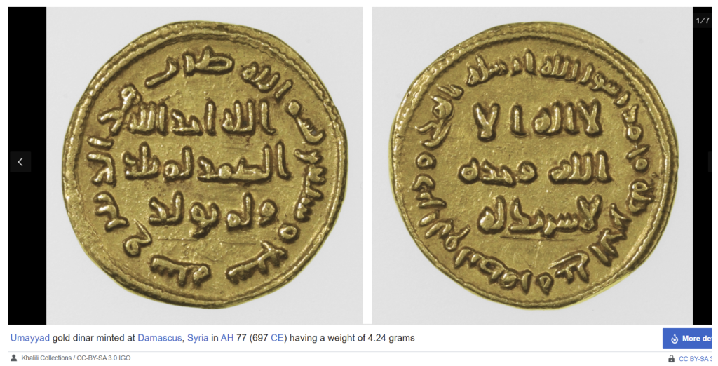 Nümismatik veya sikkecilik kanıtlarından görülen Doğu İslam topraklarında dolaşımda olan farklı bir iman ifadesi daha mevcuttur. Kökeni Irak olan bu iman şekli 72 / 692 yıllarında Suriye’ye girmiştir. Bunun iyi bir örneği Abdulmelik b. Mervan tarafından Dımeşk de bastırılan paralarda görülür. Bu sikkeler ön yüzünde Herakleios ile oğulları, Herakleios tasvirleri ve arka yüzünde dört basamaklı bir kaide üzerinde haçı ve Konstantinopolus darphanesinin adını taşıyan daha eski Bizans sikkelerini taklit eder. Abdulmelik b. Mervan bazı sembolleri (örneğin haçı) kaldırmış, ancak sikkelerin piyasada kabul görmesi için genel düzeni korumuştur. Bizim açımızdan önemli olan, arka yüzde saat yönünde yazılmış Arapça kenar yazısıdır. Bu yazı şu şekildedir: